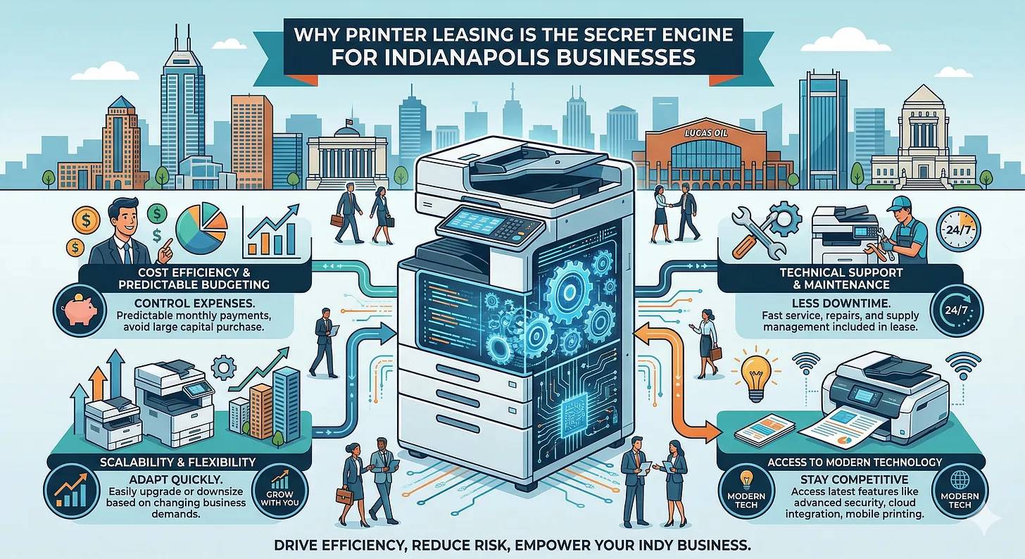 In a city known for the “Greatest Spectacle in Racing,” Indianapolis businesses know that speed, precision, and reliability aren’t just for the track—they are the requirements for staying competitive in the Crossroads of America. Whether you’re a tech startup in the 16th Street Tech Bridge, a law firm overlooking Monument Circle, or a manufacturing hub near the Speedway, one question eventually stalls every office manager: “Should we buy our printers or lease them?” In 2026, the answer for savvy Indy leaders is clear. Printer leasing is no longer just a financial fallback—it is a vital strategic move. Here is why leasing is the high-octane fuel your company needs. |